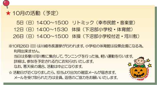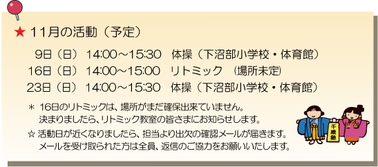 元気で明るい先生方がご指導くださり、子供たちもとても楽しく活動しています。下沼部小学校と授産学園ではプログラムが違っていますので、好きな方に参加(両方の参加ももちろんOK)してください。兄弟児も参加できますのでご家族そろっていらしてください。